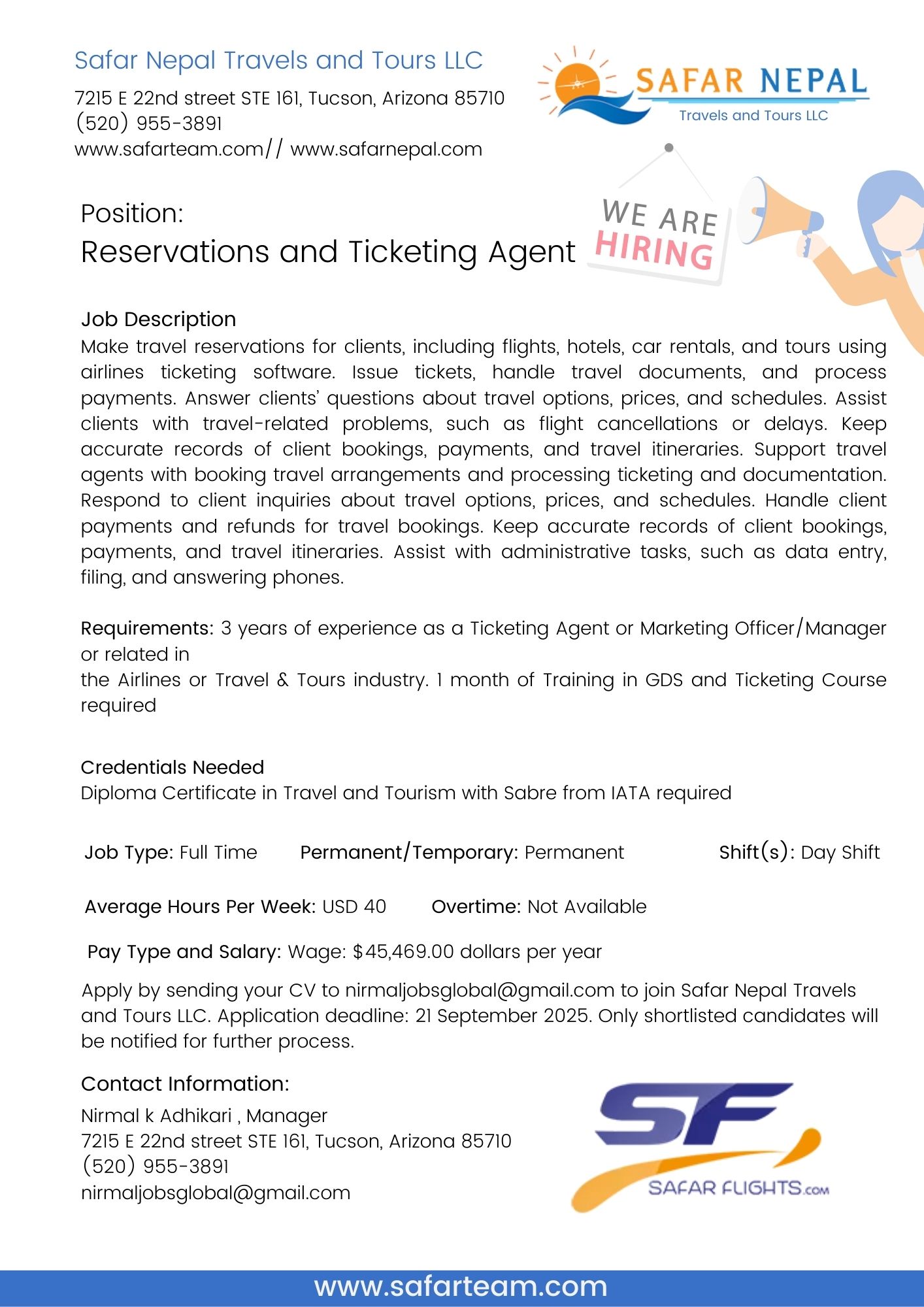 Interested Canidates are required to send their CV and other relevant documents at business@safarteam.com. For any inquiry and assistance, please feel free to contact us and our HR team will reach you out within 3 business days.